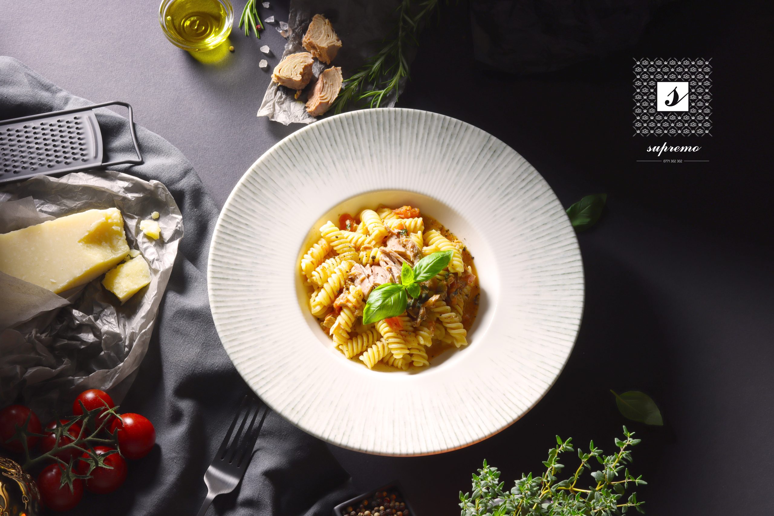 paste, sos de roșii, ton bucăti, parmezan, ulei de masline extravirgin, condimente.