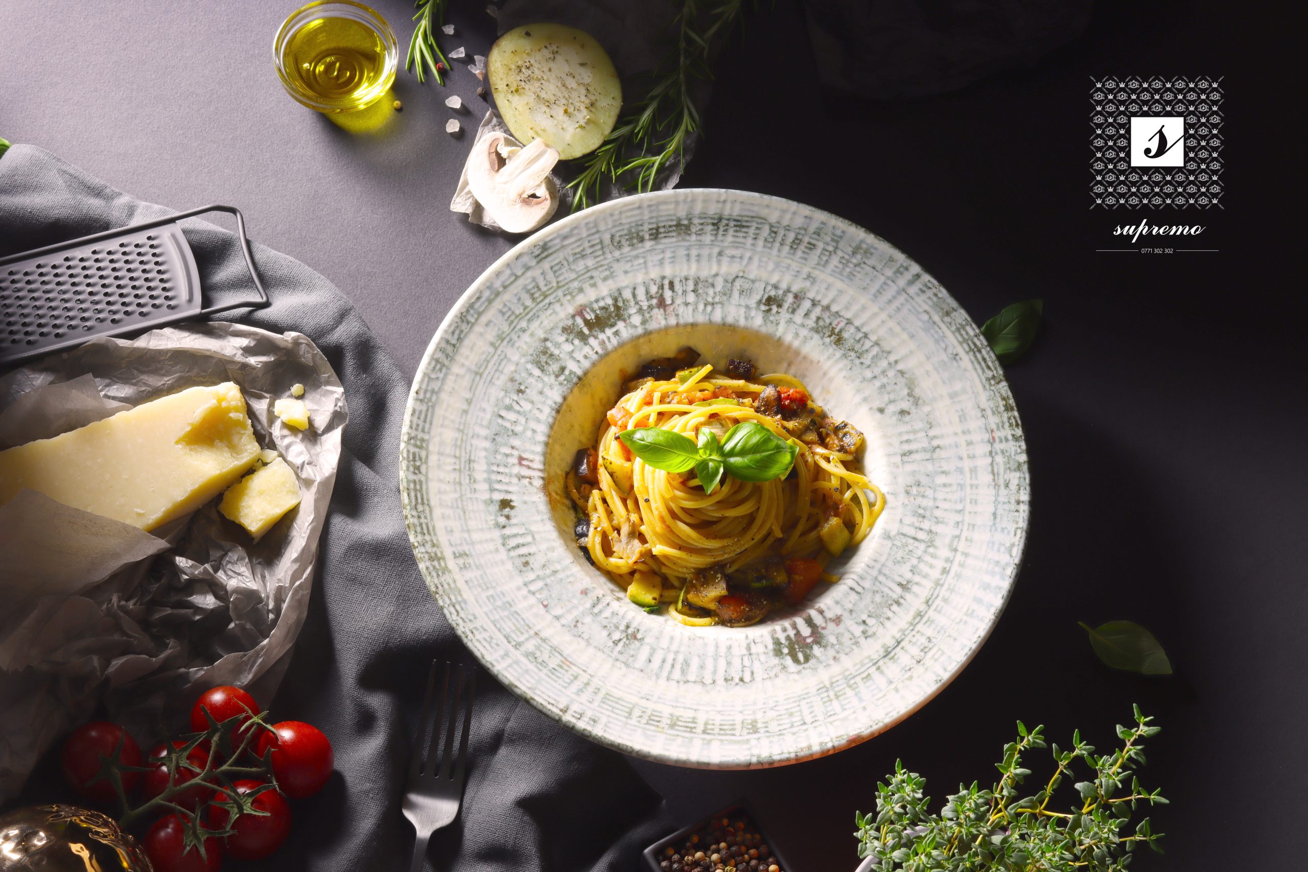 paste, sos de roșii, vinete, dovlecel, ceapă, ciuperci, usturoi, ulei de masline extravirgin, condimente.