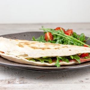 lipie, şunca crudă, mozzarella, sos de roşii, rucola, roşii proaspete, sos alb cu usturoi.