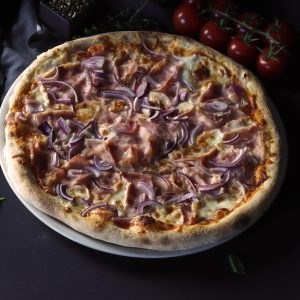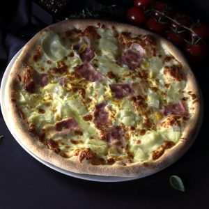aluat, sos de roşii, mozzarella, şuncă, ardei, măsline, ciuperci proaspete.
