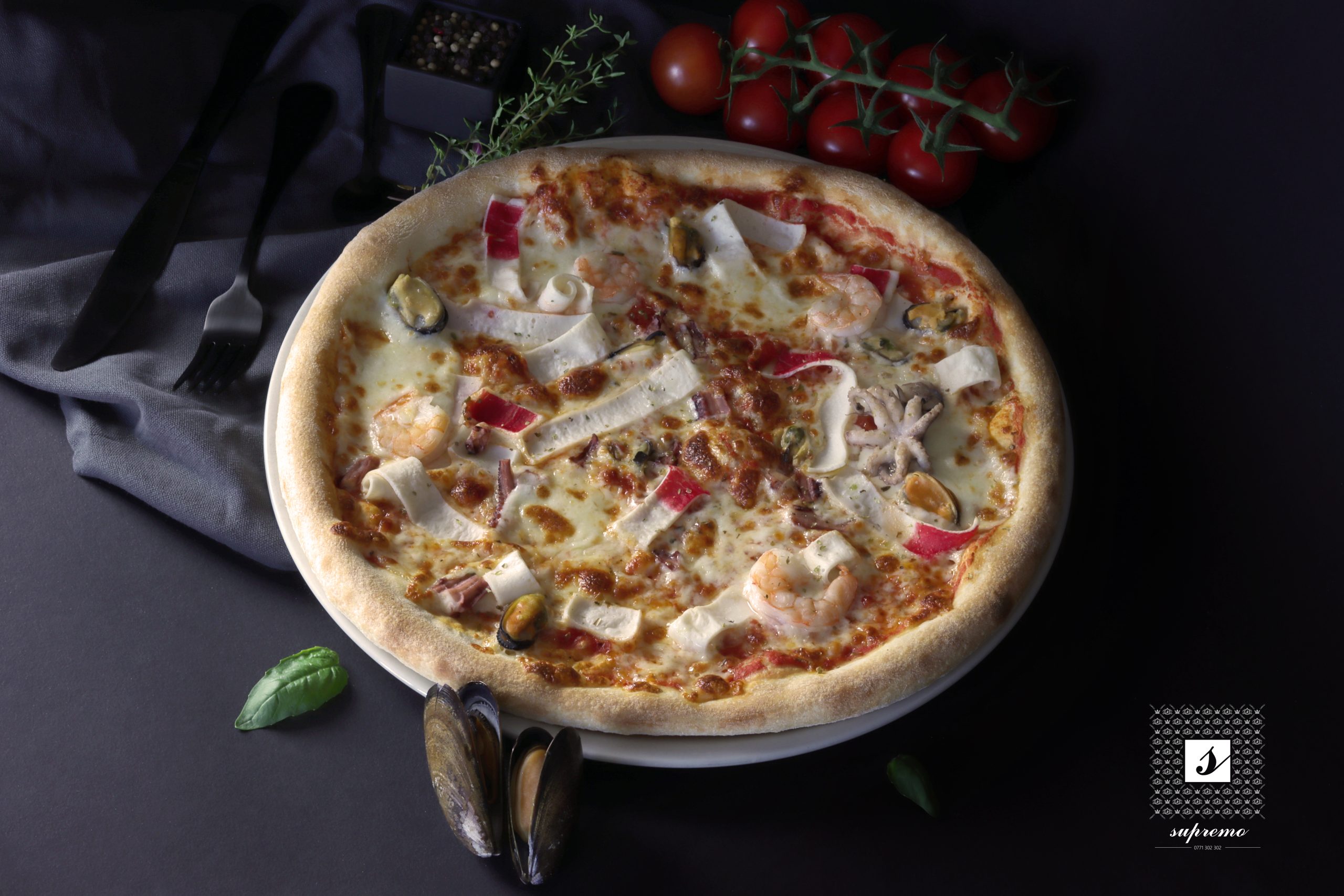 aluat, sos de roşii, mozzarella, caracatiţa*, calamar*, surimi*, scoici*, creveţi*.