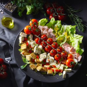 brânză cremoasă, măr, seminte de dovleac, migdale, salată, șuncă crudă, bacon, pâine prăjită, ulei de măsline extravirgin, cremă de oțet balsamic, sos alb aromat - 520g